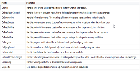 The event handlers provided with SSIS (The event handlers themselves are also extensible) are: