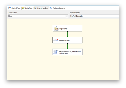 It is important to realise the role that the container hierarchy of a SSIS package plays here. Understanding containers is central to understanding SSIS and they are especially relevant for event handlers. Event handlers can be attached to any container in the package and that event handler will catch all events raised by that container and any child containers of that container. Hence, we can attach an event handler to the package (which is itself a container) and this one event handler will catch all events raised of that event type by every container in the package. This is powerful because it means we do not have to build event handlers for each task in the package.