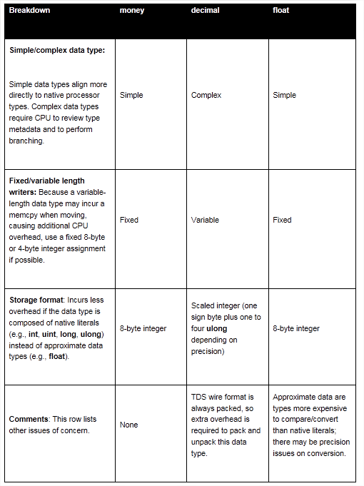 The reason for the performance improvement is because of SQL Server’s Tabular Data Stream (TDS) protocol, which has the key design principle to transfer data in compact binary form and as close as possible to the internal storage format of SQL Server. Empirically, this was observed during the SSIS 2008 – world record ETL performance test using Kernrate; the protocol dropped significantly when the data type was switched to money from decimal. This makes the transfer of data as efficient as possible. A complex data type needs additional parsing and CPU cycles to handle than a fixed-width type.