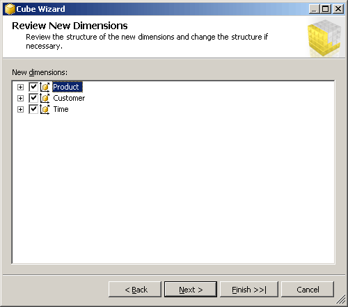 5.On the Review New Dimensions page, review the structure of the dimension hierarchy of the three dimensions by expanding the tree control to view the hierarchies and attributes that the wizard detected for each dimension.