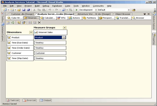 In this view of the Analysis Services Tutorial cube, you can see the cube dimensions that are used by the Internet Sales measure group. When a cube has multiple measure groups, cube dimensions might be used with some measure groups but not with others. Also, you define the type of relationship between each dimension and each measure group in which it is used. In Lessons 4 and 5, you will learn more about dimension usage and dimension to measure group relationships.