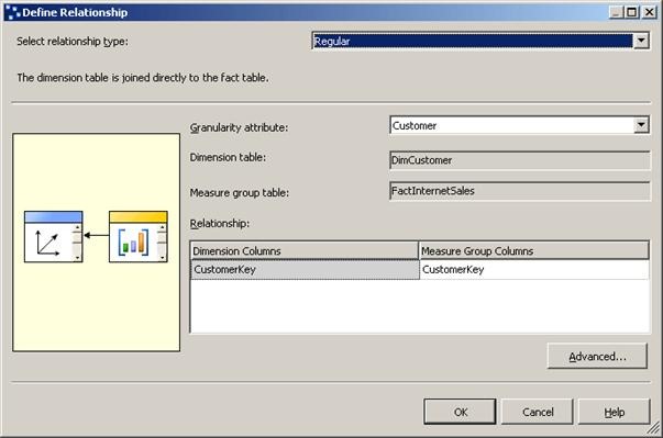 The Define Relationship dialog box appears. In this dialog box, you define the custom dimension properties within a specific measure group. By default, dimensions have the same behavior in each measure group. However, they can have different behavior in different measure groups. Notice that the relationship of the Customer dimension to the Internet Sales measure group is a Regular relationship, which means that the DimCustomer dimension table is directly joined to the FactInternetSales measure group table. Notice also that the granularity of this dimension is at the lowest level, namely the Customer level, but that you can define different levels of granularity. In Lesson 5, you will learn about defining a custom granularity level.