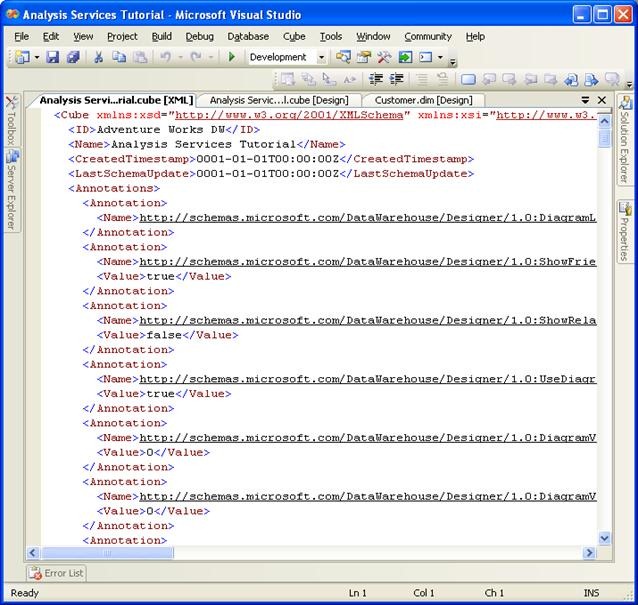 The XML code for the Analysis Services Tutorial cube is displayed on the Analysis Services Tutorial.cube [XML] tab. This is the actual code that is used to create the cube in an instance of Analysis Services during deployment.