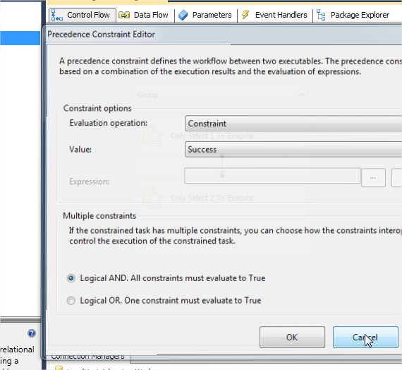In Connection task , I mistakenly click on precedence constrain editor , And when i cancelled same i saw fade and fast effect of that prompt screen .