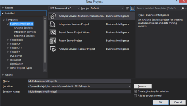On 6 Mar 2013 SQL Server were released SQL Server Data Tools – Business Intelligence for Visual Studio 2012 (SSDT BI) templates. With SSDT BI for Visual Studio 2012 we can develop and deploy SQL Server Business intelligence projects.