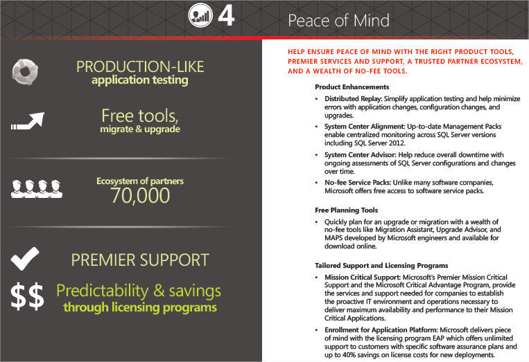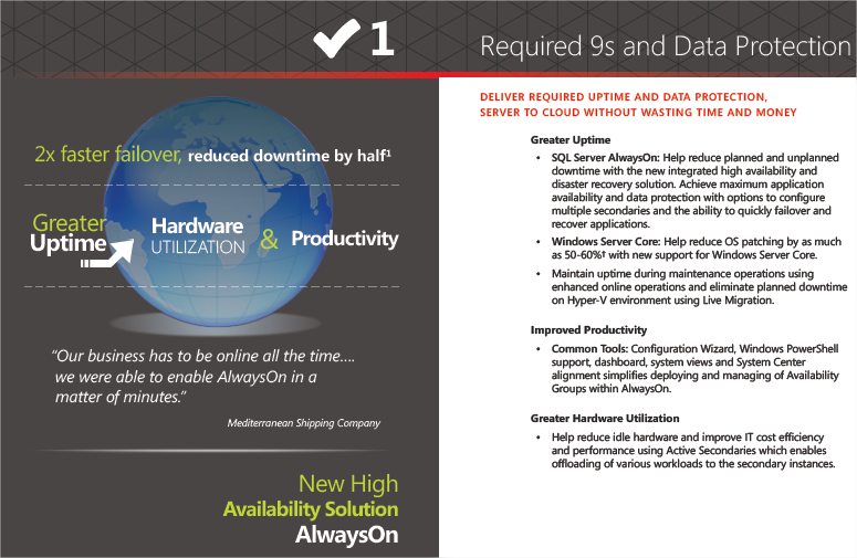 SQL Server 2012 helps meet industry requirements for high availability with the new SQL Server AlwaysOn for mission critical availability while ColumnStore Index helps enable blazing-fast datawarehouse query performance.