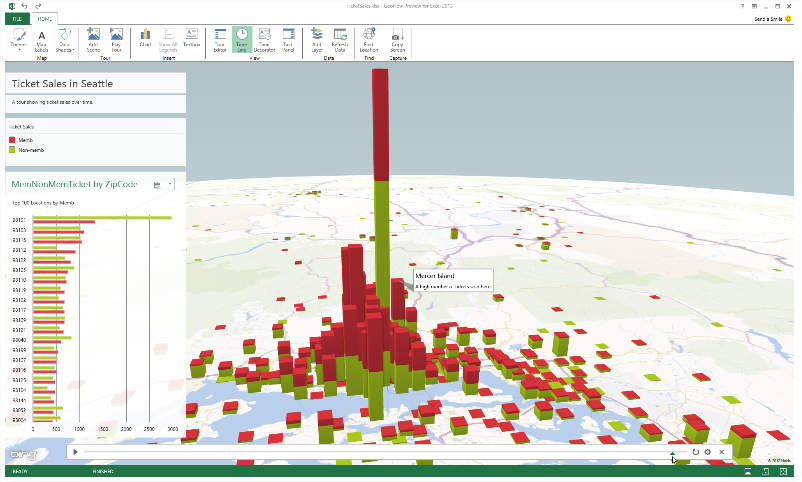 This preview gives you an early look into the new features that provide 3D data visualization for Excel and a powerful method for people to look at information in new ways, enabling discoveries in data that might never be seen in traditional 2D tables and charts.