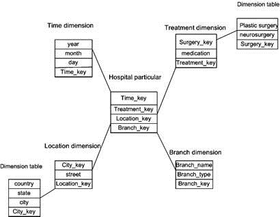An example for hospital particular is shown in the figure the hospital particular is the same as that of the star schema in figure the single dimension table for treatment in the star schema is normalized in snowflake schema, resulting in a new treatment, type_of_surgery dimension table. For example, the treatment dimension table now contains the attributes surgery_key, medication and treatment_key. The surgery_key is linked to the type_of_surgery dimension table, containing plastic surgery, neurosurgery and surgery_key.