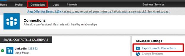 Click on Connection and then click setting after that on Export LinkedIn Connection, as shown in below image –