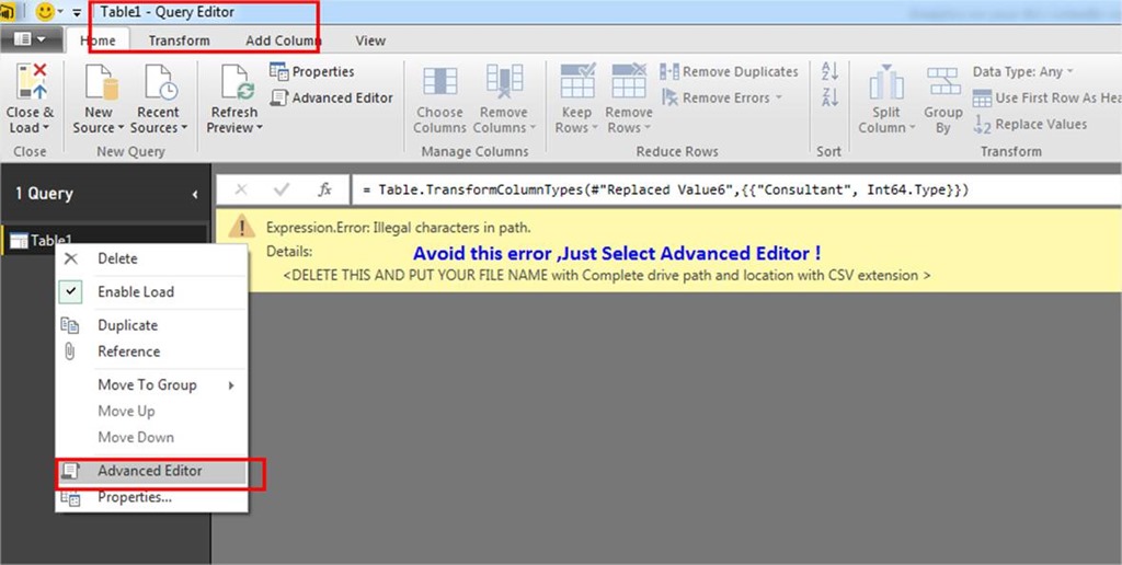 Next image is nothing but what you will actually see in your Power BI Desktop, Also Click on Advance Editor as shown.