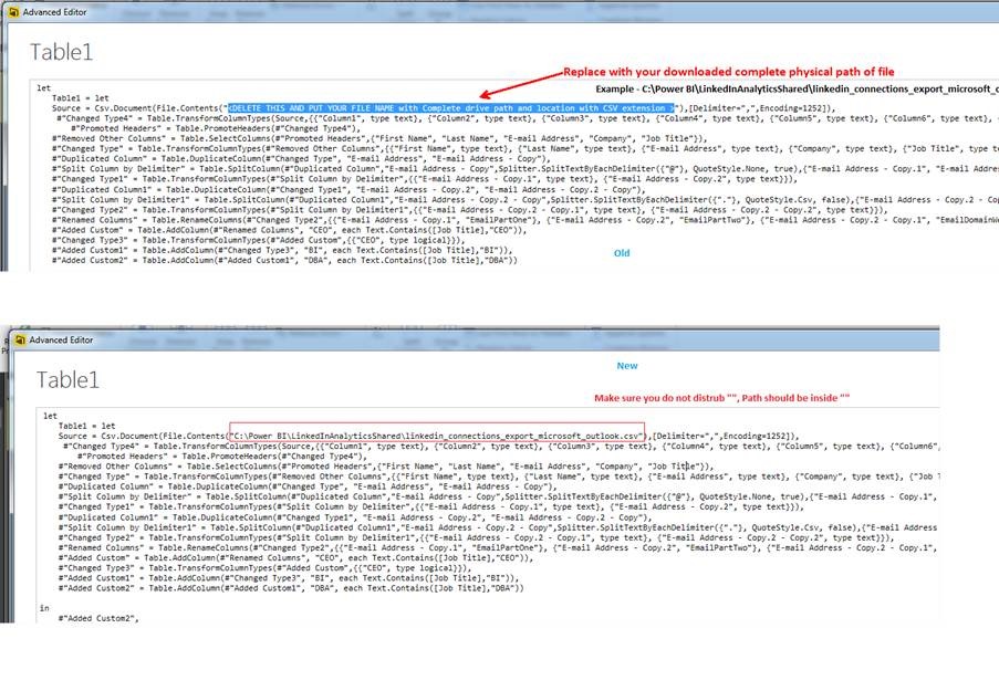 Don’t get scared with M language, You don’t have to do coding here, you just need replace one address, which is physical file path complete address of your downloaded LinkedIn File, CSV Export.