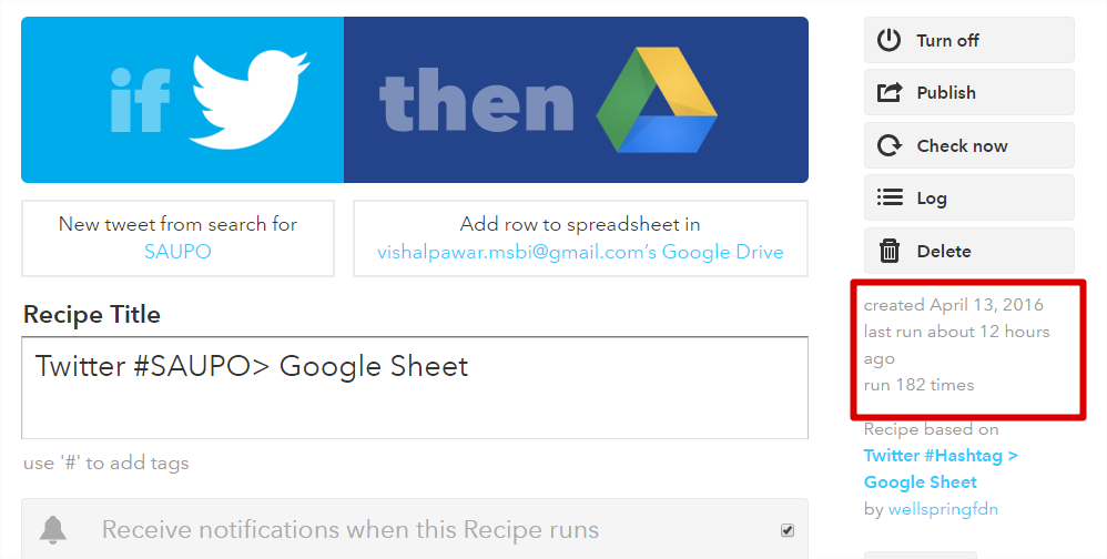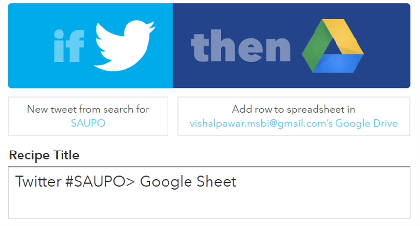 - Step 2 – Create recipe in IFTTT to store twitter data into Google sheet