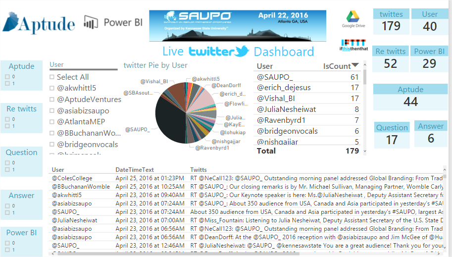 I have build the below live twitter dashboard for the SAUPO 2016 event, I am really happy to share all details about it!, With actual file and presentation to make this work in live activities during any event.