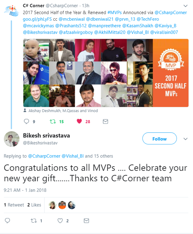2017 Second Half of the Year & Renewed #MVPs Announced via @CsharpCorner https://t.co/gYmzXdwZCY cc @mcbeniwal @dbeniwal21 @prvn_13 @TechFero @mcavickymas @Prashants512 @manpreethere @KasamShaikh @Kaviya_B @Bikeshsrivastav @afzaalvirgoboy @AkhilMittal20 @Vishal_BI @viralJain007 pic.twitter.com/JmVcnvBDek