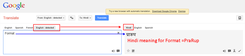 This just give tool Indian touch ! , Just go and type format word in Google Translator which shows result as below !